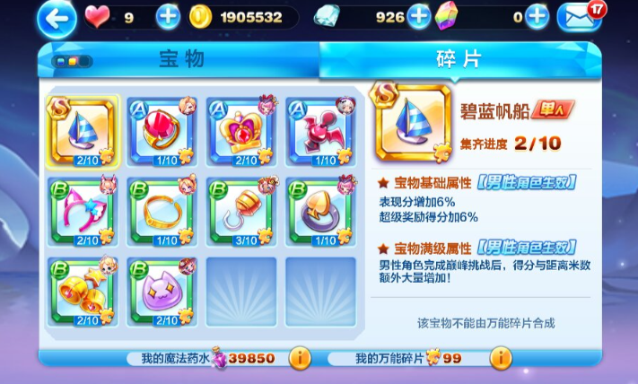 宝物搭配是天天酷跑中提升得分能力的关键因素,合理的组合能够显著增强角色性能。游戏中的宝物系统分为四大类别:滑翔系角色专用、多跳系角色专用、女性角色专用和男性角色专用。选择宝物时首先要明确角色属性,多跳系角色如四段跳的水力型宝应优先搭配大地之心,而拥有滑翔能力的角色则更适合火焰之心。男性角色可选择海洋之心提升表现分,女性角色则对应森林之心。专属宝物对特定角色有极强加成,应当作为核心装备。