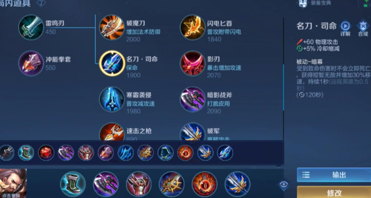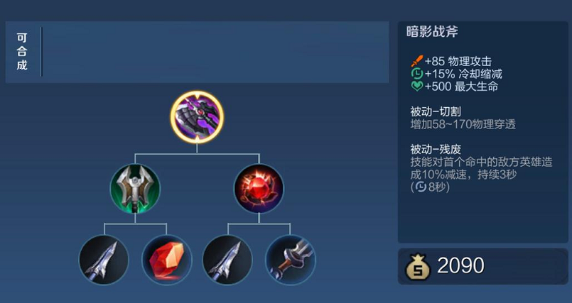 鞋子之后,第一件核心输出装备通常选择暗影战斧。这件装备对曹操来说简直是量身定做,它提供的物理攻击、冷却缩减和物理穿透属性曹操全都需要。 15%的冷却缩减能让你的技能转得更快,不管是用来清兵、位移还是打消耗都更频繁。而穿透属性让你在前期对线战士或者中期去切敌方后排脆皮时,都能打出可观的伤害。 做完暗影战斧,曹操就初步具备了威胁敌方后排的能力。