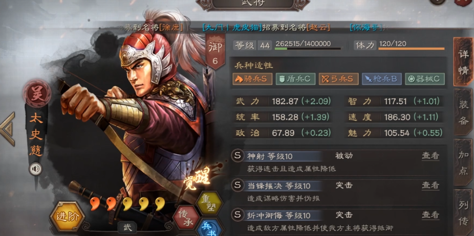 他自身传承出来的战法折冲御侮,虽然这是一个偏向辅助的突击战法,但它在A级战法里绝对算得上是神技。它的效果是普攻后可以大幅降低敌方单体的统率和智力,并且如果我方主将不是太史慈自己,还能给主将加两次抵御效果。这意味着太史慈在队伍里可以很好地保护核心大哥,同时破掉敌方的防御,让队友打得更痛。对于新手来说,如果你的太史慈不是队伍里的主要输出点,带上折冲御侮去配合孙权、甘宁这类主将,队伍的生存和输出环境都会改善很多。