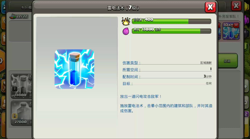 闪电法术的伤害并非一成不变,其威力等级提升而显著增强。高阶的闪电法术单次伤害非常高,足以对高血量建筑构成严重威胁。游戏版本的更新也对闪电法术进行了优化,其攻击机制从过去的多次落雷调整为一次性的强力雷击,在伤害数据和作用范围上都得到了实质性的加强。