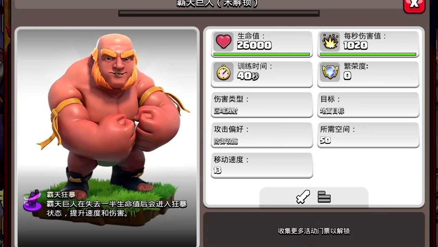 巨人在游戏中是平民玩家必练的核心前排肉盾,其训练成本低廉且生命值高,能有效吸引敌方防御建筑的火力,为后排输出单位创造安全的进攻环境,因此从游戏前期打资源到中高本部落战都是不可或缺的角色。培养巨人需要先升级实验室,并准备好足够的圣水资源,在实验室中点击巨人图标即可开始升级研究,每次升级都会显著提升其生命值与攻击力。
