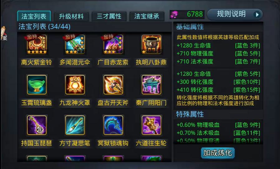 装备注灵前需开启对应品质灵孔,灵孔数量与装备品级直接挂钩,金色装备最多可开4个灵孔,紫色装备3个,蓝色装备2个,绿色装备1个,高阶装备可兼容低阶注灵石,低阶装备无法镶嵌高品质注灵石,开孔需消耗对应道具,开孔后可自由镶嵌或无损取下注灵石,方便随时调整搭配。注灵石基础属性涵盖生命、物理强度、法术强度、防御等核心数值,蓝色及以上品质注灵石额外附带随机洗炼属性,物理输出英雄优先选物理穿透、暴击率、暴击伤害加成、技能伤害加成类注灵石,法术输出英雄侧重法术穿透、技能伤害加成、法术强度强化类注灵石,肉盾辅助英雄则选择生命加成、防御加成、英雄伤害减免、御心率类注灵石,御心率属性能在受击时概率降低30%伤害,是肉盾英雄的优质选择。